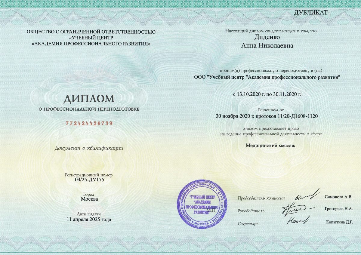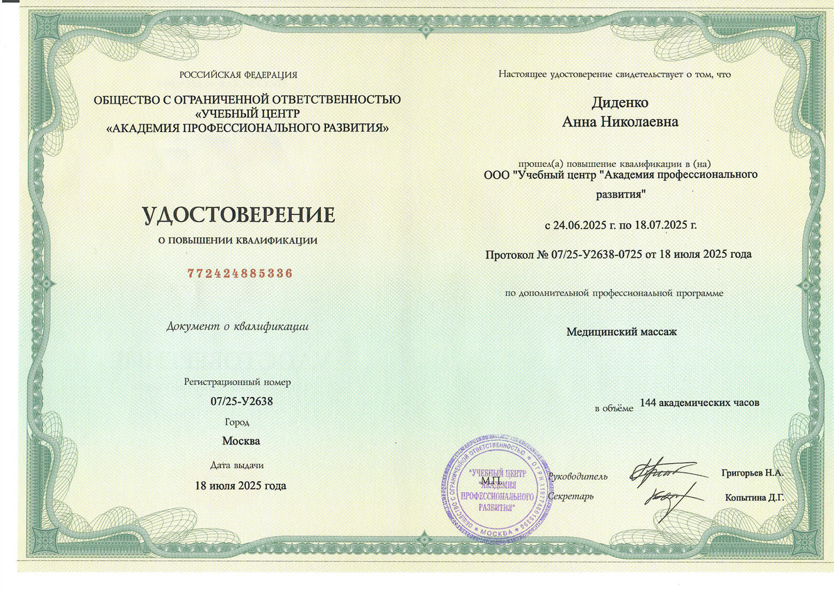Ищете специалиста, который поможет вернуть свободу движений и избавиться от боли? Анна Николаевна Диденко — профессионал с более чем пятилетним опытом в области медицинской реабилитации и миофасциальной терапии. В совершенстве владеет техниками глубокотканного массажа, лимфодренажа, клинической нейродинамики. Её опыт и знания позволяют эффективно работать с широким спектром проблем опорно-двигательного аппарата — от хронических болей в спине до восстановления после травм.